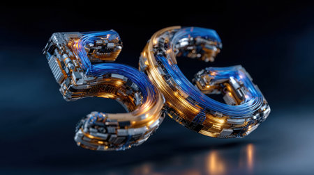 A futuristic looking 5G symbol is lit up in blue and gold. The symbol is surrounded by electronic components, giving it a futuristic and technological feel