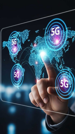 5G Next-Generation Mobile Connectivity Illustrated on a Processor Touched by a Human Hand.