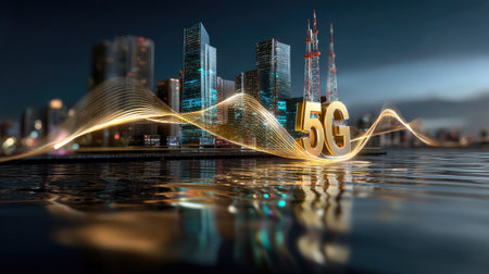 A stunning cityscape visual featuring a prominent 5G symbol illuminated at night, reflecting on water with modern skyscrapers and vibrant lights showcasing urban innovation.