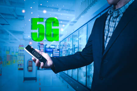 A man wearing a suit holds a mobile phone on the screen in a world shape with 5G letters floating on the screen. The background is layered and the shelves are blurred.