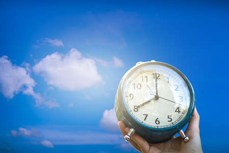Selective focus of alarm clock with blue sky background time life concept.