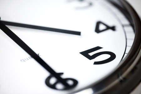 A Modern white wall clock with aluminium frame. Close up to a wall clock, the pointers at half pass 4. Selective focus on the number 5 or 5 o'clock. Reflections in the aluminum frame of the watch.