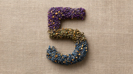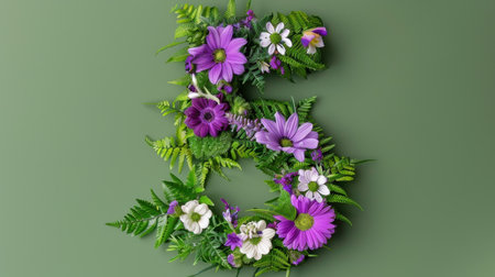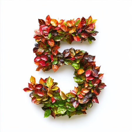 An artistic floral arrangement forming the number five, surrounded by lush green leaves and colorful blooms, perfect for nature-inspired designs.