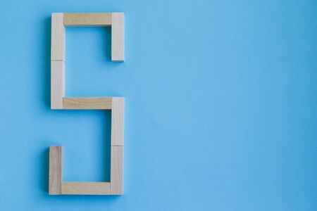 Golden number 5 and stars confetti on a blue background. Festive composition.