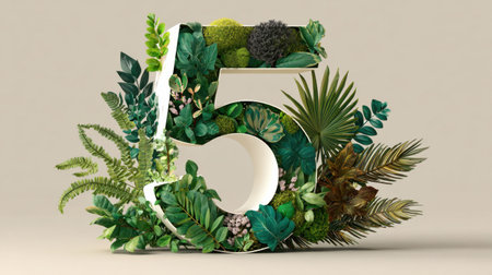 A stunning depiction of the number five adorned with various lush green plants and foliage, capturing the essence of nature's beauty and growth.