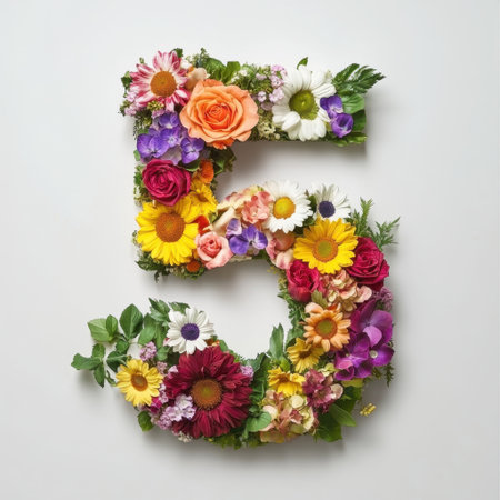 Vibrant and artistic number 5 formed with assorted flowers and leaves on a light background, perfect for adding a cheerful touch to events, celebrations, or designs.