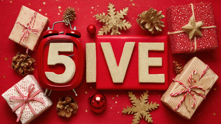 Capture the essence of the holiday season with this vibrant arrangement featuring gifts and decorative elements on a bright red background.