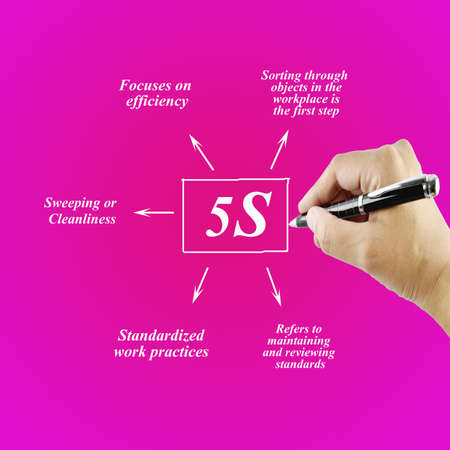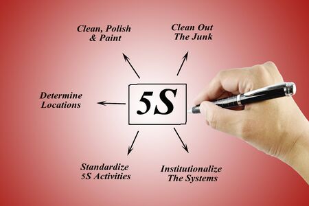 Woman hand writing element of 5S principle on white background for used in manufacturing.