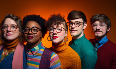 Group of five diverse young adults with trendy glasses against an orange backdrop.