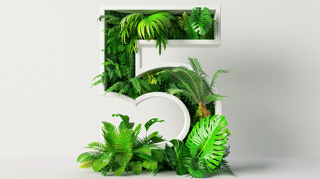 A striking composition showcasing a large white number five adorned with a variety of lush green plants and leaves, creating a vibrant and fresh atmosphere ideal for nature-themed projects.