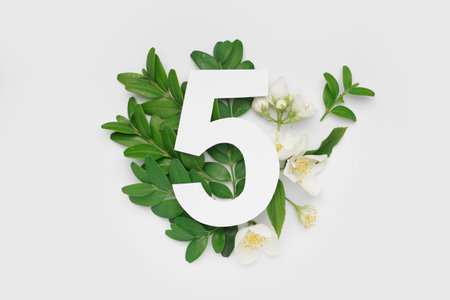 Green leaves and flowers with paper number five on white background