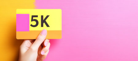 Woman s Hand Holding a Colorful Card With the Text 5K on a Pink and Yellow Background