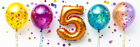 Golden Number 5 Balloon with Colorful Confetti Balloons, Birthday Celebration Concept