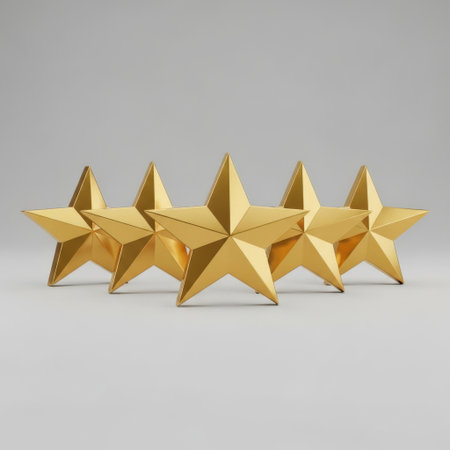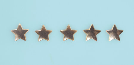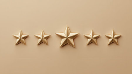 A close-up shot of five golden stars, with the central star being larger, set against a plain, light-colored backdrop.