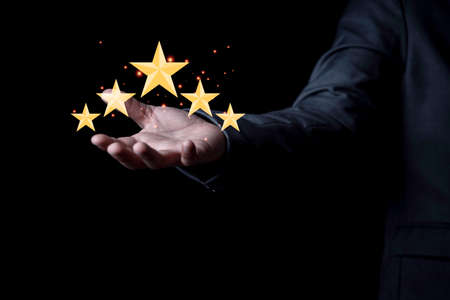 Businessman holding virtual five stars for customer feedback rating and evaluation concept.