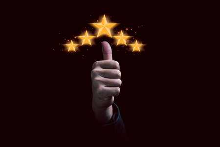 Hand and thumb rise up with five golden stars for client excellent rating and customer evaluation of product service concept.