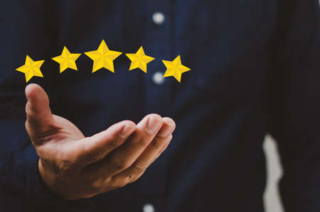 Rise on increasing five stars in human hand, Increase rating evaluation classification concept