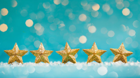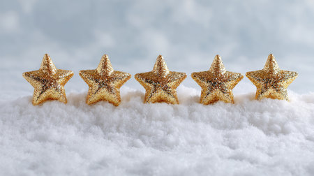 Five glittering gold stars sit perfectly aligned on a soft white snowy surface, creating a magical scene with a dreamy background. Ideal for festive themes.