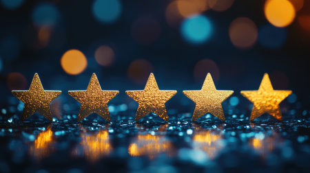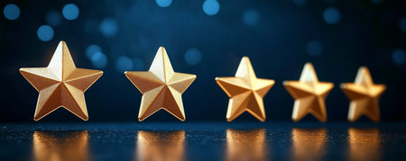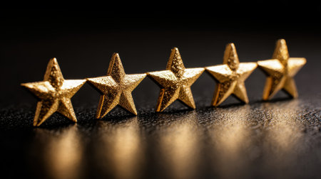 Golden five star rating symbols arranged in a row on a dark reflective surface showcasing excellence and high quality in design and recognition concepts