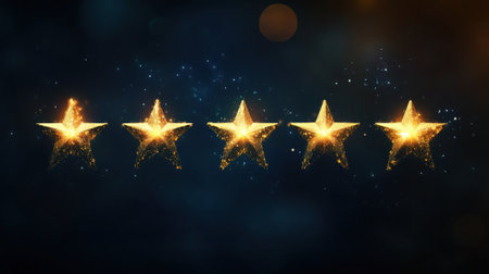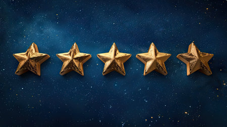 Five golden stars elegantly arranged on a dark backdrop symbolize excellence and recognition, perfect for showcasing achievements, awards, or accolades in design.