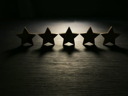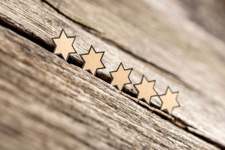 Five stars in a row on a rustic wooden boards. Conceptual of service rating and quality of trade.