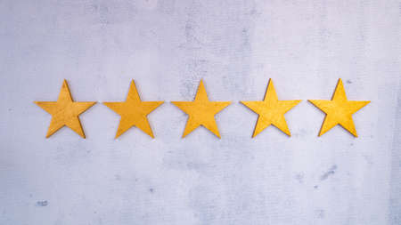Top quality rating. Evaluation and classification. Five yellow stars with copy space.
