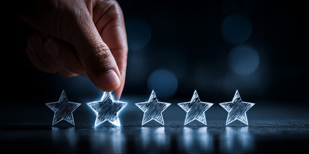 Evaluation and Feedback Process Represented by Rating Stars and a Hand Focused on Five Stars for Reviews and Customer Satisfaction