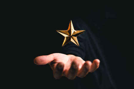 golden star rating on hand in dark background,rating