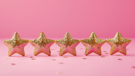 Five golden glitter stars on a pink background with small star confetti.