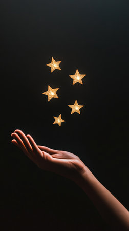 Woman hand holding golden shiny stars on dark background, perfect for concepts related to holidays, summer, travel, hotel service, and resorts