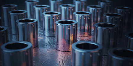A captivating close-up view of metallic cylinders scattered in an industrial environment, showcasing intricate details, reflections, and textures in silver and blue hues.