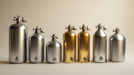 This image showcases a collection of metallic gas cylinders in various sizes and finishes, perfect for industrial and commercial applications.