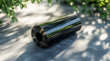 A glossy black cylinder rests on a gray surface, surrounded by lush green leaves. Natural light casts soft shadows, creating a peaceful atmosphere.