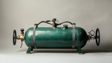 This image showcases a classic vintage gas cylinder featuring a brass valve, ideal for themes around industry, mechanics, and retro design.