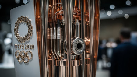 Tokyo 2020 Olympic torch detail, internal mechanics, bokeh lights.