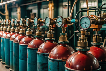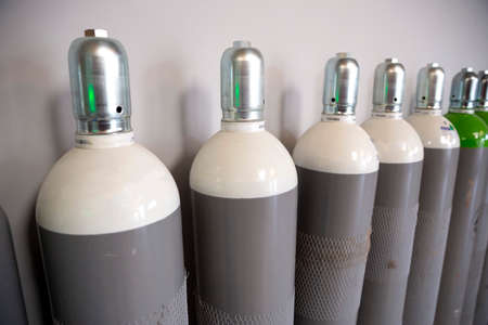 A row of industrial gas storage cylinders, showcasing modern design and functionality in a professional facility. Ideal for applications in various industries and environments.