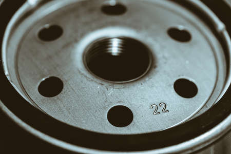 Monochrome background image of oil filter close up. Art macro photography of auto part.