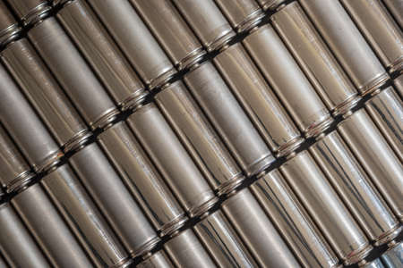 close-up of silvery gas cylinders stand on top of each other in even rows in a warehouse