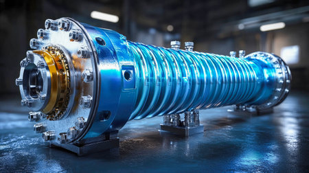 A futuristic industrial heat exchanger with polished metallic details, bolts, and mechanical components in a high-tech setting.