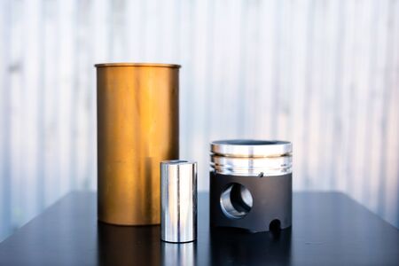 New pistons and cylinder head of engine block vehicle. Motor capital repair. Sixteen valve and four cylinder. Car service concept. The job of a mechanic. Old and new pistons.
