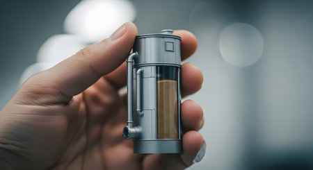 A person's hand is holding a small, miniature model of a modern industrial cylinder or silo, with a window revealing a sandy-looking substance inside. The image conveys concepts of technology, small-scale models, and industrial design.