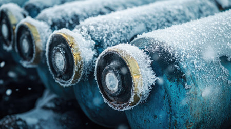 A detailed shot of gas cylinders with frost forming on their surfaces due to pressure release.