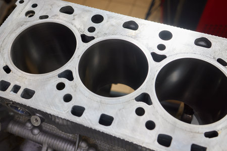 Open engine block exposing the interior parts and springs, service and maintenance concept in garage