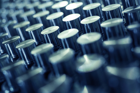 Rows of polished metal cylinders with reflective surfaces arranged on a textured metallic base.