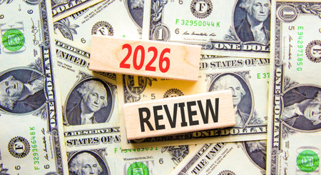 Review 2026 symbol. Concept words Review 2026 on beautiful wooden blocks. Beautiful dollar bills background. Dollar bills. Business and review 2026 concept. Copy space.