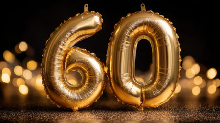 Golden 60th birthday celebration balloons with glittering bokeh background.
