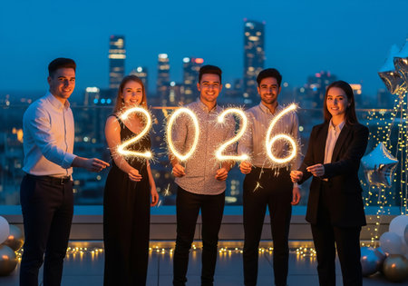 A diverse group of young professionals joyfully celebrate the arrival of 2026 on a rooftop overlooking a vibrant cityscape at dusk, creating a festive and optimistic atmosphere.