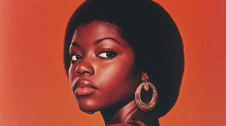 Portrait of a woman with stylish earrings and radiant afro against orange background