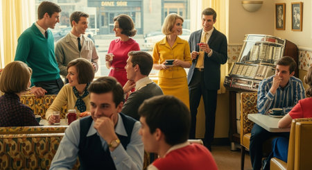 People fashion clothing 1950, 1960 in the style of iconic rock and roll imagery, Times of driving music, trendy hairstyles, stylish clothes, daring deeds, leather jackets and colorful dresses