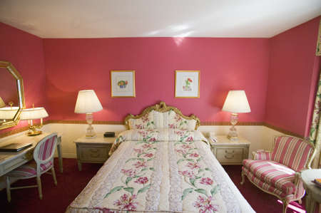 Interior of a hotel bedroom, bedroom with a bed and chest of drawers